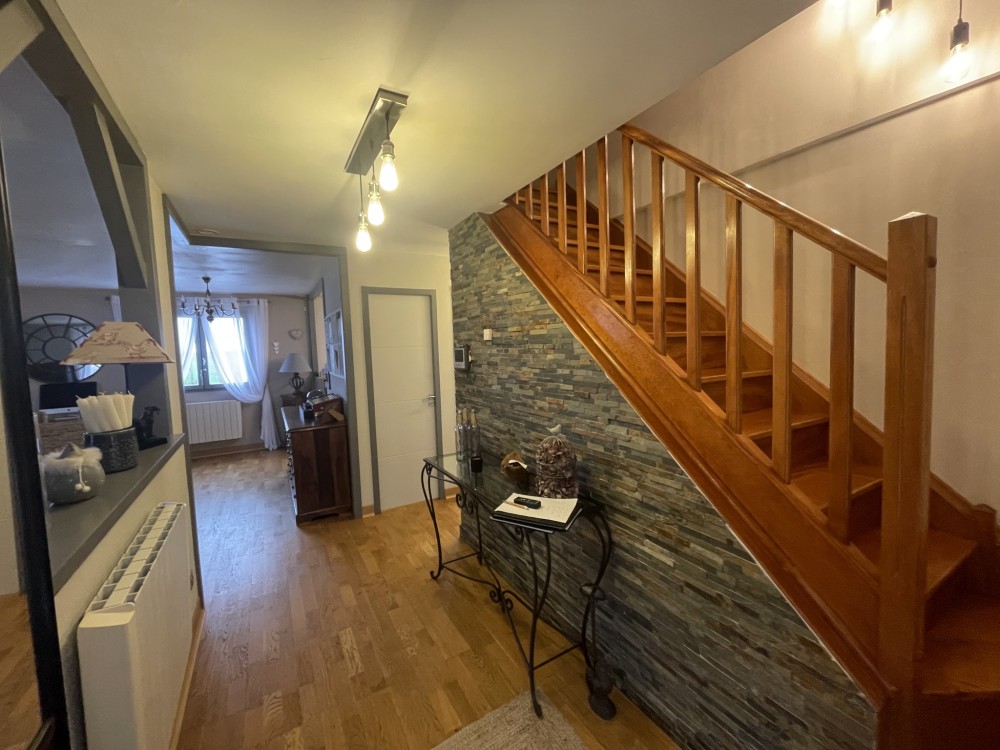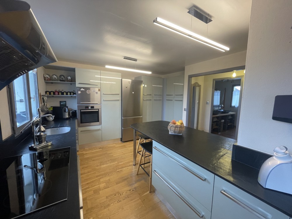 Au rez-de-chaussée, l'entrée dessert un salon séjour lumineux avec cheminée (insert), une cuisine semi-ouverte aménagée et équipée avec des matériaux de qualité (plan de travail en ardoise), une salle de bain avec double vasque et douche à l'italienne, ainsi qu'un wc indépendant.
