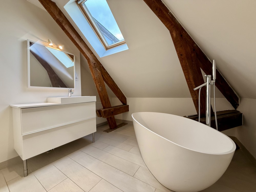 À l'étage, vous trouverez trois chambres et une agréable salle de bains équipée d'une baignoire îlot et d'une douche à l'italienne.